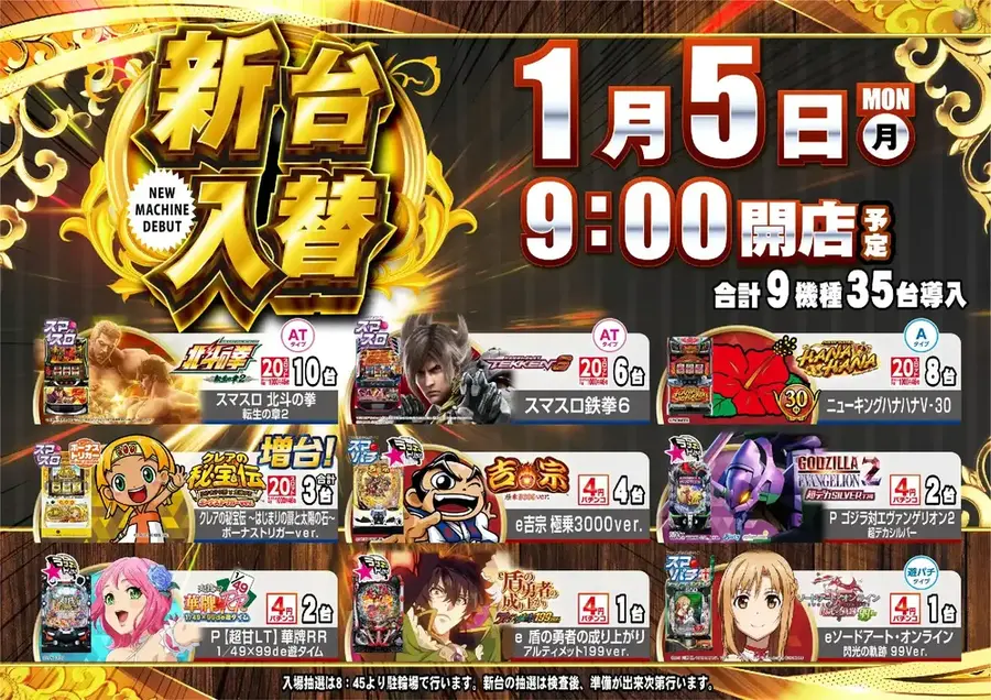 本日もダイナム相模原店のブログを閲覧いただき誠にありがとうございます。 1月5日新台入替予定!詳しくは記事をチェック!!!! |