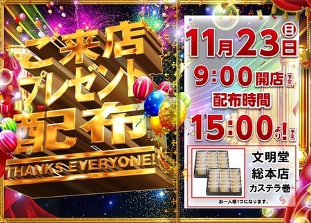 ■□■□■□■□■□■□■□ 11月23日(日) 朝9時OPEN!! ≪ご来店プレゼント≫ (総付景品配布) 15時~開始(予定) ■□■□■□■□■□■□■□ 文明堂総本店 カステラ巻 (お一人様1つになります) ■□■□■□■□■□■□■□ 従業員一同 心よりお待ちしております♪