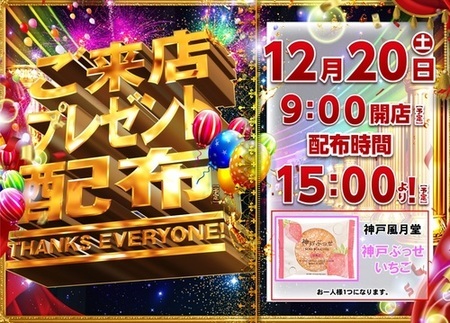 ■□■□■□■□■□■□■□ 12月20日(土) 朝9時OPEN!! ≪ご来店プレゼント≫ (総付景品配布) 15時~開始(予定) ■□■□■□■□■□■□■□ 神戸風月堂 神戸ぶっせ(いちご) (お一人様1つになります) ■□■□■□■□■□■□■□ 従業員一同 心よりお待ちしております♪