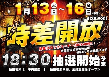 ☆彡■□■□☆彡□■□■☆彡 1月もダイナム観音寺店へ!! ↓↓↓↓↓↓↓↓↓↓↓ 13日(火)~16日(金) 4DAYS!! スロットコーナー1BOX40台対象 時差開放 18:30抽選開始 (予定) ☆彡■□■□☆彡□■□■☆彡 お休みのお客様 お仕事終わりのお客様 お誘いあわせの上 ぜひご来店下さいませ☆彡 抽選場所・抽選方法 対象コーナーなど ↓↓↓詳細はコチラ↓↓↓