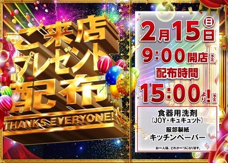■□■□■□■□■□■□■□ 2月15日(日) 朝9時OPEN!! ≪ご来店プレゼント≫ (総付景品配布) 15時~開始(予定) ■□■□■□■□■□■□■□ 食器用洗剤 (JOY・キュキュット) 服部製紙 キッチンペーパー (お一人様どれか1つになります) ■□■□■□■□■□■□■□ 従業員一同 心よりお待ちしております♪