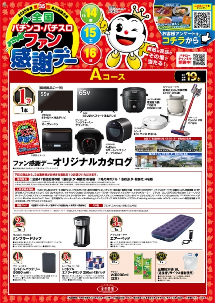 いつも当店のHPをご覧いただき 誠にありがありがとうございます♪♪ ★☆★☆★☆★☆★☆★☆★☆★☆★☆★☆ 第35回 パチンコ・パチスロファン感謝デー ★☆★☆★☆★☆★☆★☆★☆★☆★☆★☆ 11月14日(金) 11月15日(土) 11月16日(日) 3日間連続での開催です。 当選賞品は店内と写真でチェック!