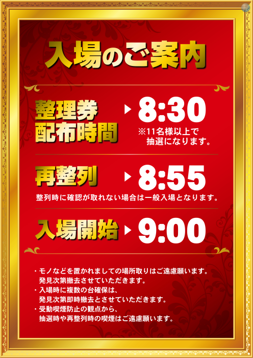 朝8:30の抽選終了後に入場順番券(整理券)をお配りいたします。 皆様のご来店、お待ちいたしております