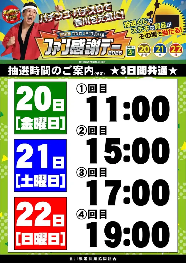 3/20(金) 3/21(土) 3/22(日)の3日間 香川県遊技業協同組合主催 第12回 かがわパチンコ・パチスロ ファン感謝デー