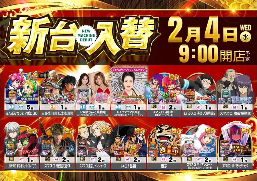 入替当日は朝9:00 OPEN(予定)となります。 8:45から正面入り口にて入場抽選を行いますので 是非あさからご来店ください