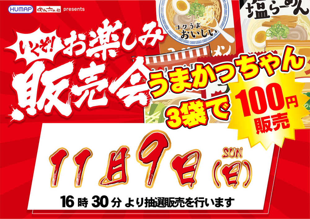 「お楽しみ販売会」 ★うまかっちゃん3袋100円販売★ 販売16:30~(予定) ★ー★ー★━★ー★ー★