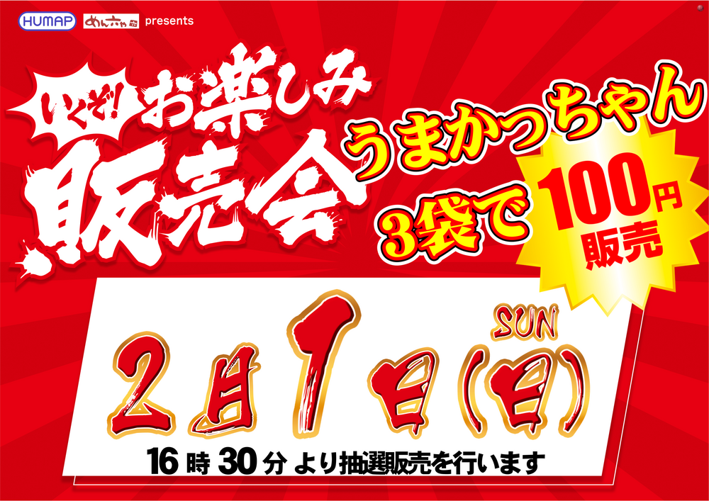 「お楽しみ販売会」 ★うまかっちゃん 3袋★ ★100円販売★ 販売16:30~(予定) ★ー★ー★━★ー★ー★