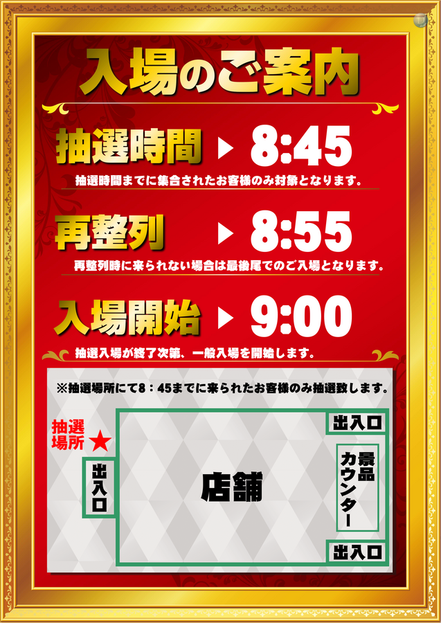 抽選場所にて、8:45までに集合されたお客様を対象に抽選致します