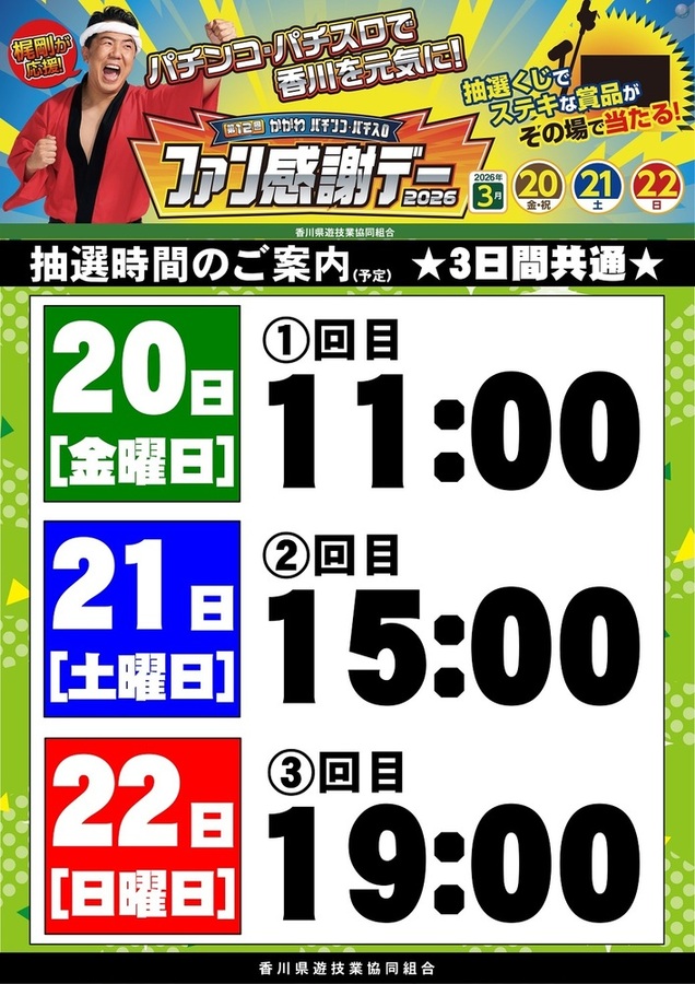 【 抽選時間のご案内(予定) 】 3月20日(金)~3月22日(日) 3日間とも毎日3回 ◆1回目 11:00~ ◆2回目 15:00~ ◆3回目 19:00~ を予定致しております♪